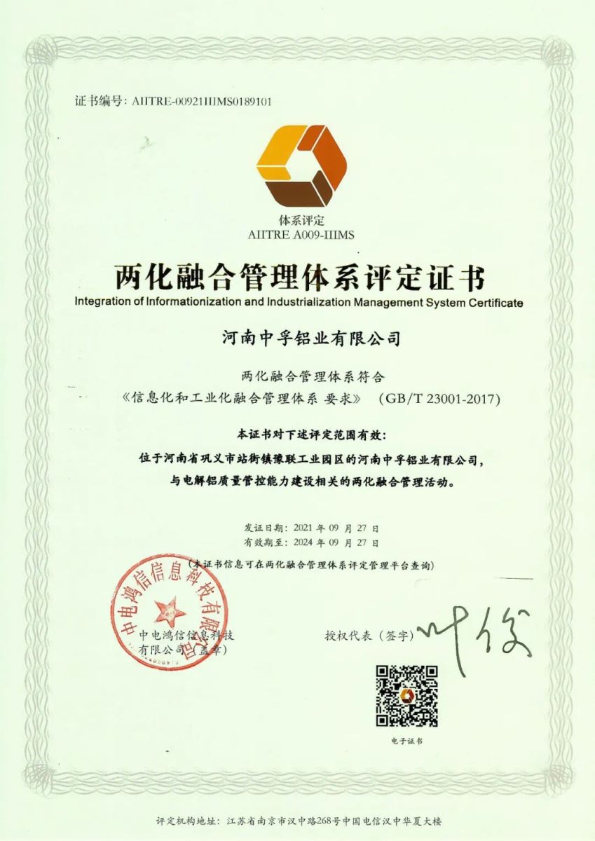 中孚鋁業公司獲得兩化融合管理體系認證證書