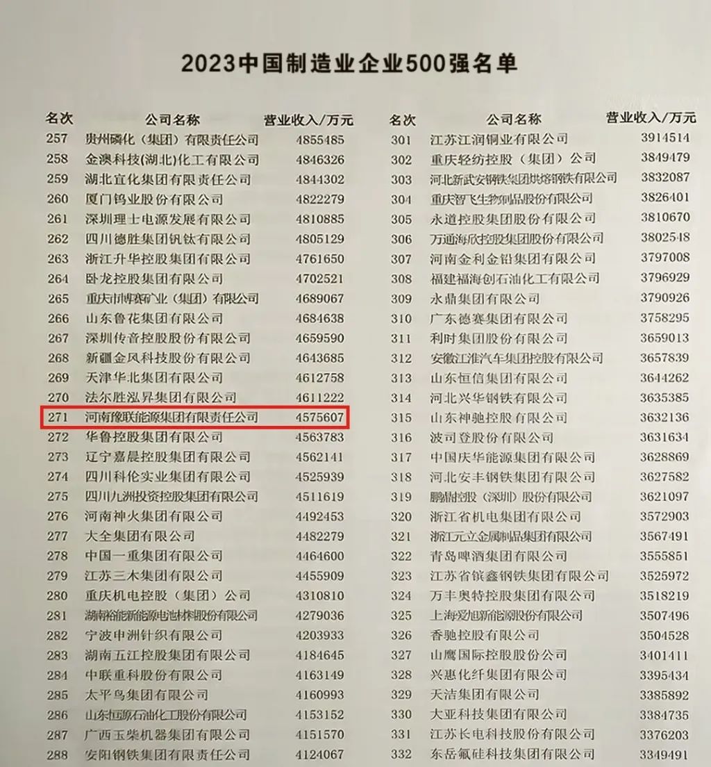 豫聯(lián)集團(tuán)上榜2023中國制造業(yè)企業(yè)500強(qiáng)第271位