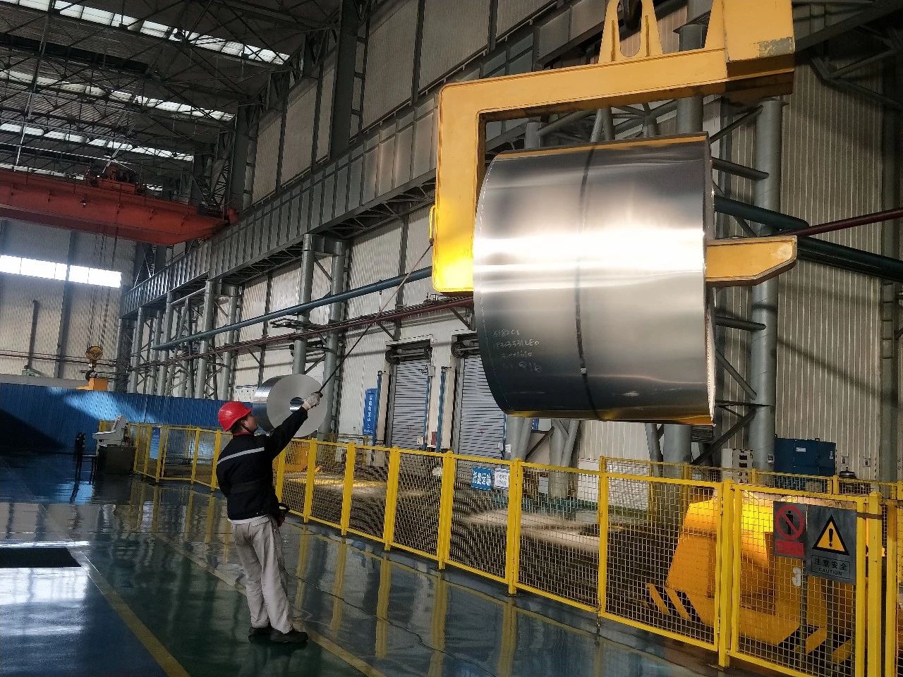 中孚高精鋁材公司:熱軋卷材下機,天車操作工在智能高倉前進行吊裝入庫。