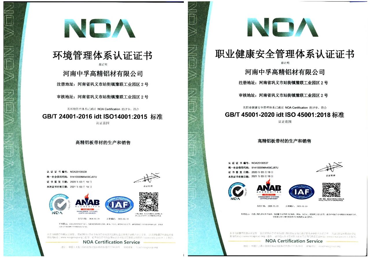 近日,中孚高精鋁材公司收到挪亞檢測認證機構頒發的《環境管理體系認證證書》和《職業健康安全管理體系認證證書》?!蹲C書》顯示,中孚高精鋁材公司環境管理體系符合GB/T24001-2016/idt ISO14001:2015標準、職業健康安全管理體系符合GB/T 45001-2020 idt ISO45001:2018標準。